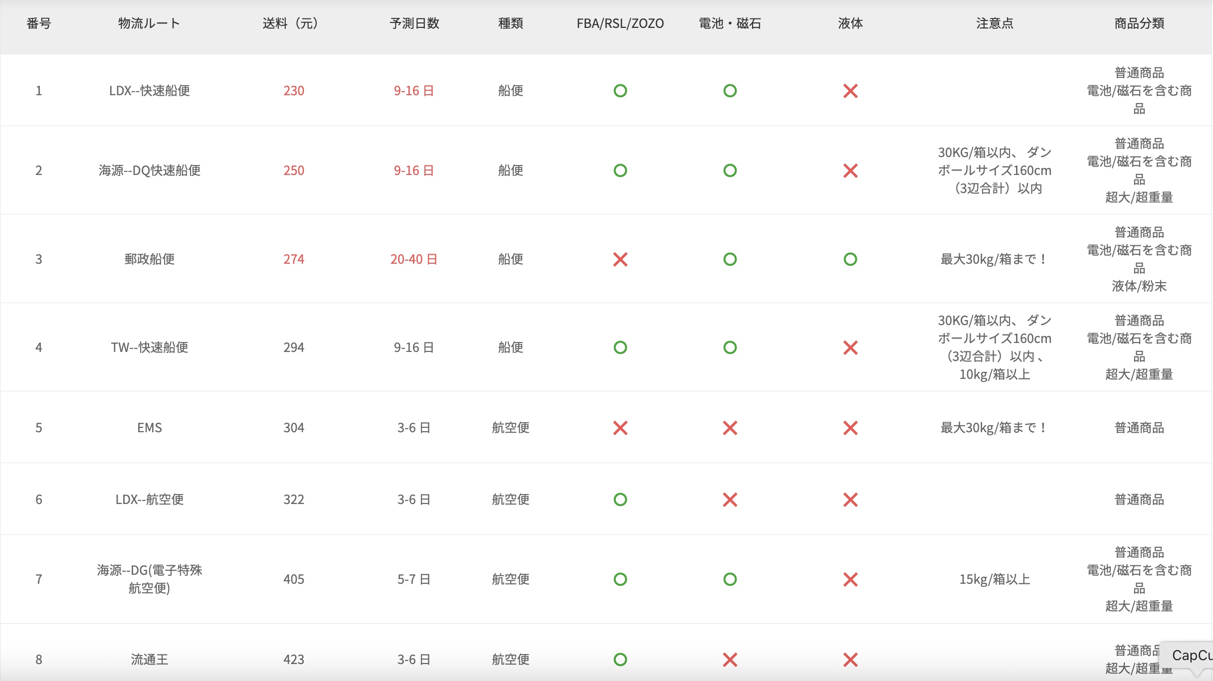 最も安い発送方法は、LDX快速船便で230元 約4774円(1元21円の場合)予測配達日数は9~16日になります。