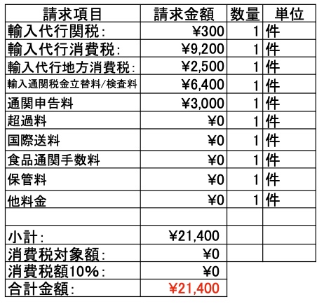 (輸入通関税金立替料:1,400円・検査料:5,000円)