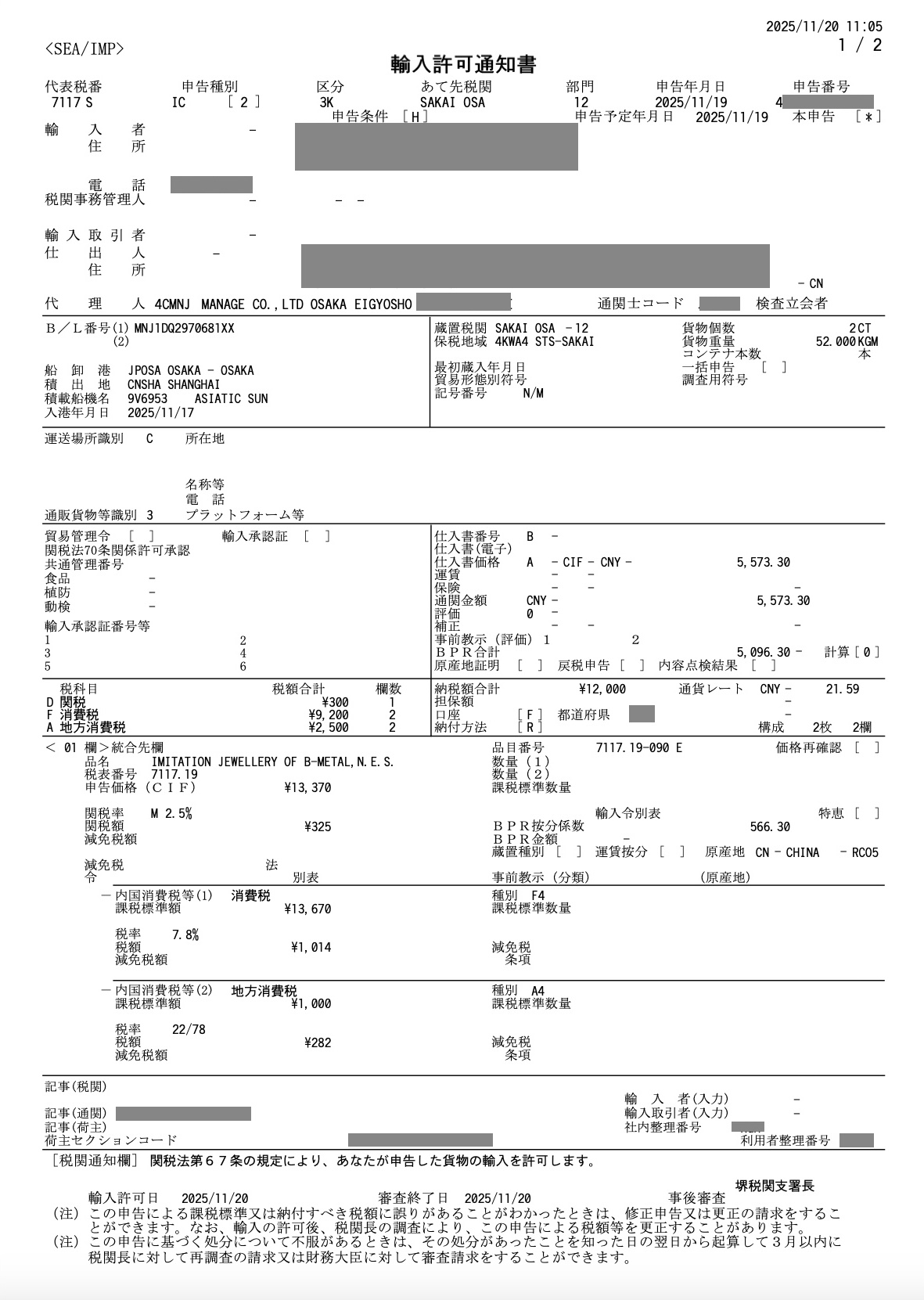 輸入許可通知書・請求書・追跡スクショをそのまま公開し、